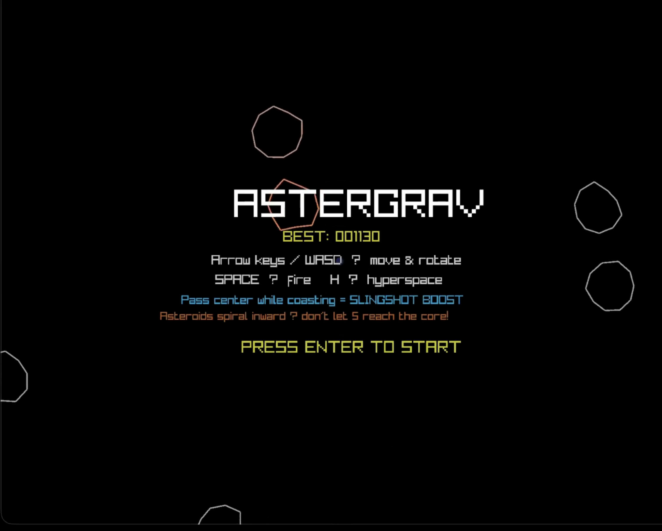 Asteroids don't just float — they're pulled toward the center of the screen by gravity. Let too many pile up and a singularity explodes, blasting everything outward. Master the gravity well and slingshot your ship around the center for a speed boost.